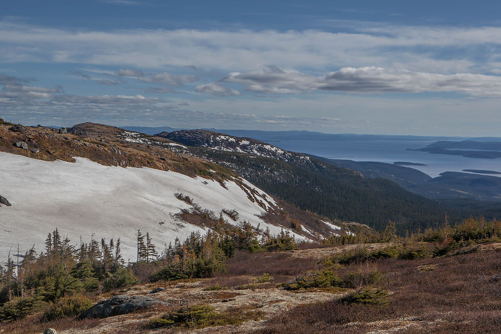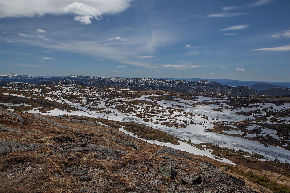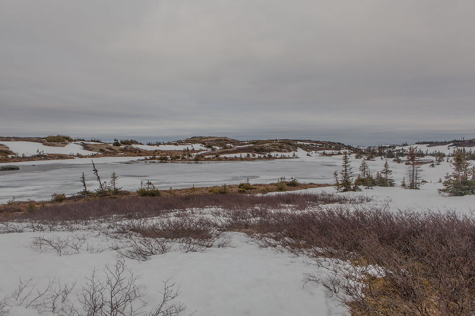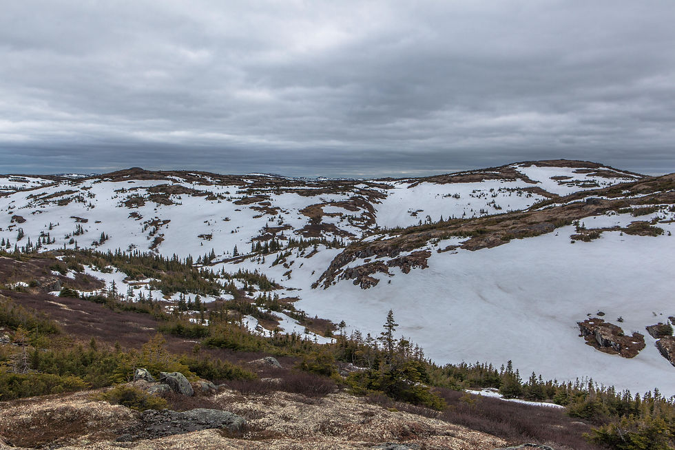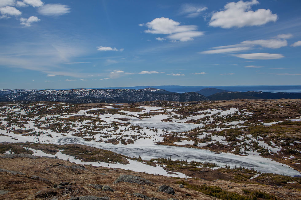 Une vue blanche de la toundra alpine, recouvert d'un sol peu déneigé.