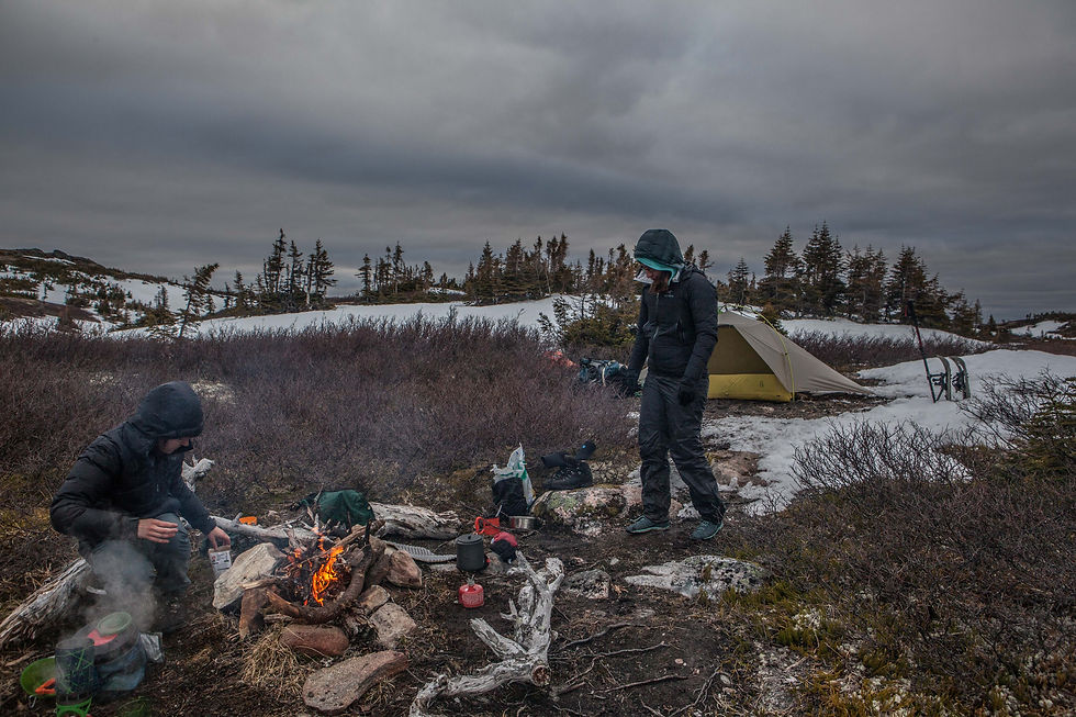 Préparation de la fine cuisine pour le souper au côté d'un feu de camp pour nous réchauffer.